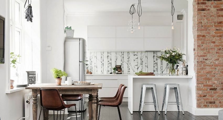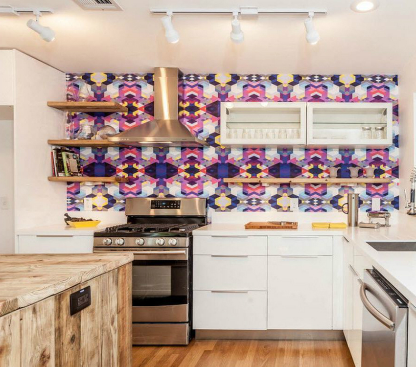 An example of successful zoning of space using contrasting washable wallpaper for kitchen decoration