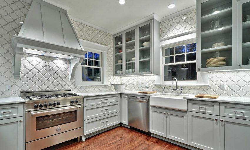 Glass fiber wallpaper, which in its structure is similar to fiberglass fabric, will look good in the kitchen. Such a finishing material has a high strength index, and its hinge structure is able to improve the microclimate of the kitchen. This is the most sustainable type of finish that does not attract static electricity and repels dust. Do-it-yourself kitchen renovation photos using glass wallpaper clearly indicate the unique uniqueness of such a room.
