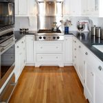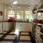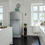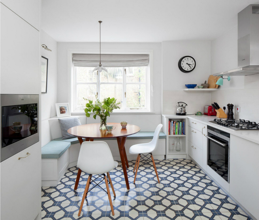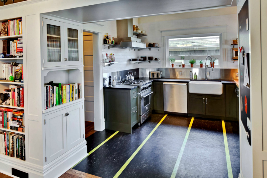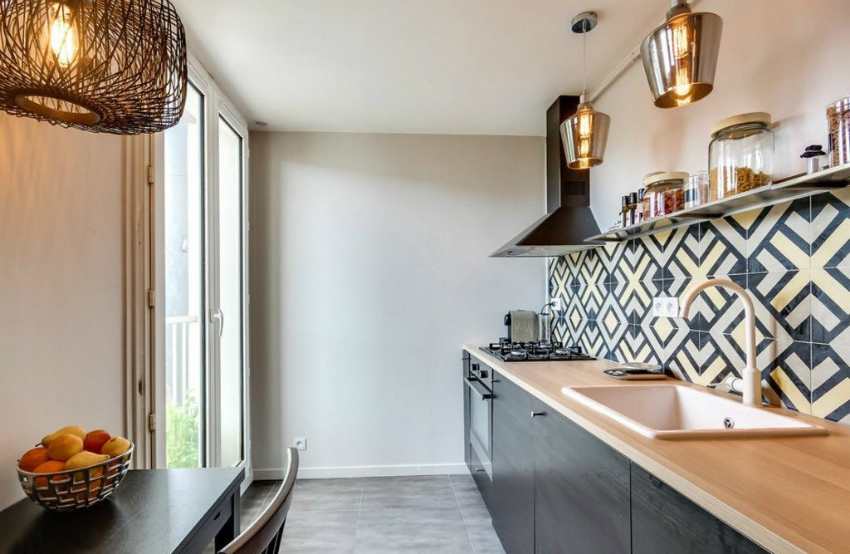 Another option for flooring is a moisture resistant laminate. However, when choosing this material, you should give preference to the high-quality and most durable options. Otherwise, the cheap material will soon become unusable. Today, specialty stores often have sales of this material. You can buy remnants of laminate in various colors at low prices, while redecorating the kitchen will cost less. These patterns can be creatively combined and thereby zone the common space.