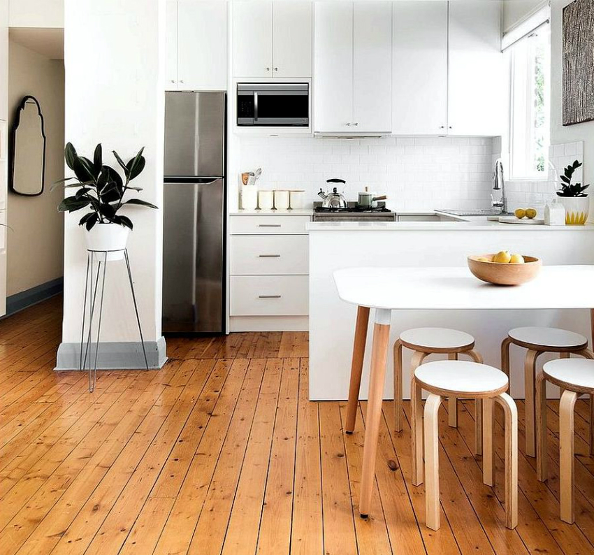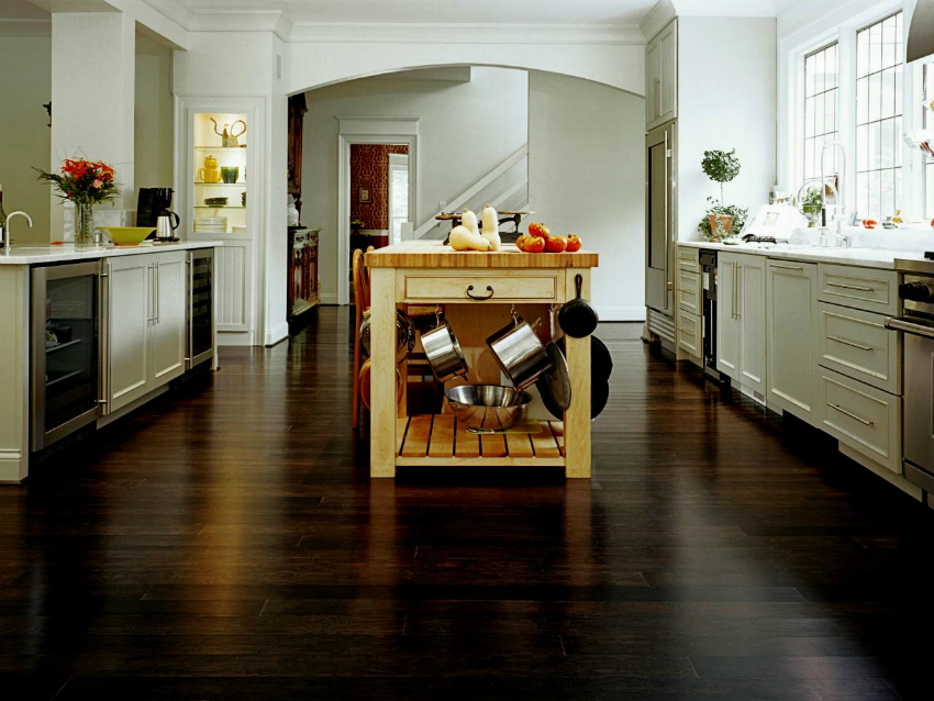 Many people prefer to lay parquet on the kitchen floor, which is an environmentally friendly material and, due to its appearance, ennobles and creates additional comfort in the room. This is where the positive aspects of this material for finishing the kitchen end. The tree has a low moisture resistance, reacts to temperature changes, is afraid of stains and requires regular special care. However, to improve its performance, manufacturers cover it with protective materials.