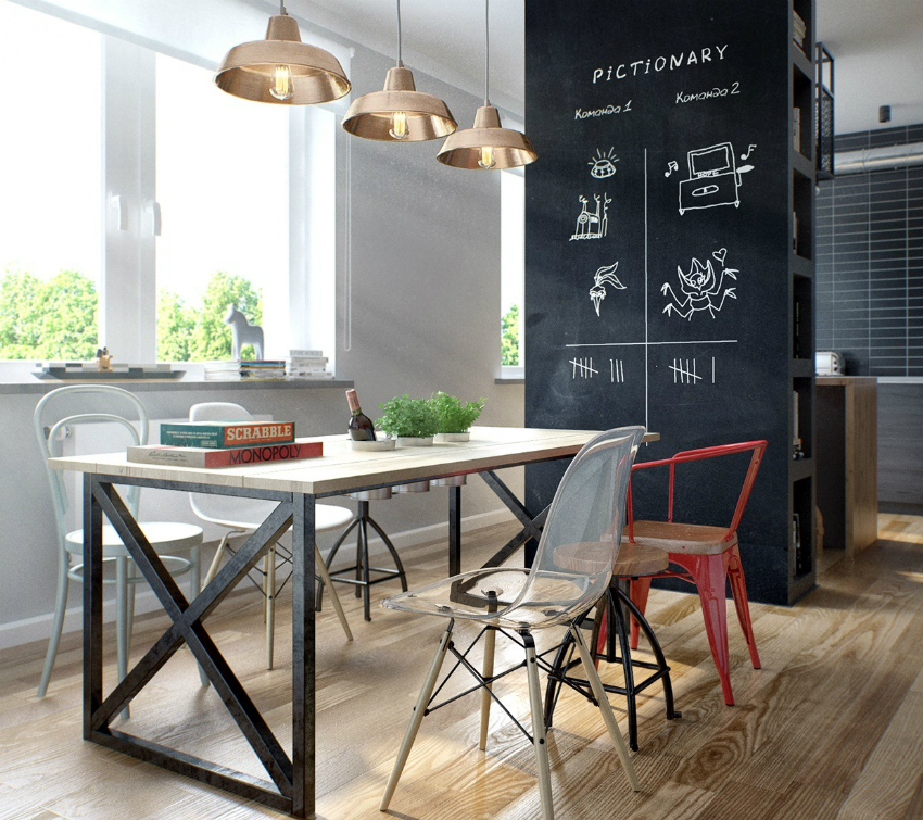 If the table is located apart, then a pendant lamp can be installed above it, which is adjustable in height. Its optimal position is when the light spot completely covers the table surface. By slightly lowering it to the table, you can give some intimacy to the dinner, and by placing it at the highest point, you can make the lighting bright and intense for a festive feast.