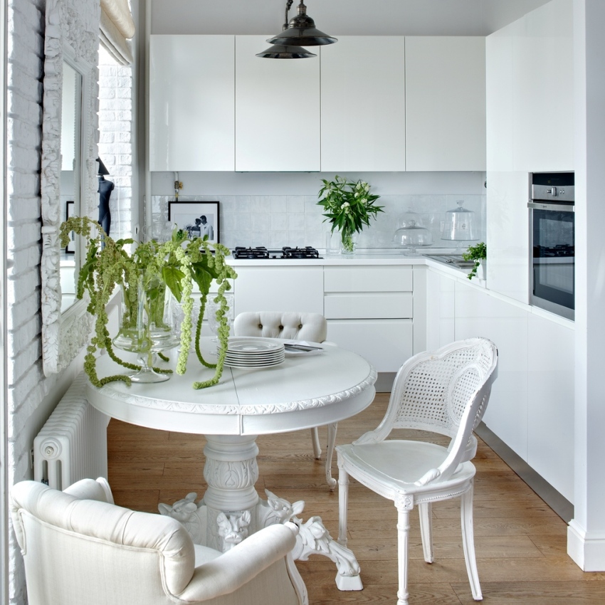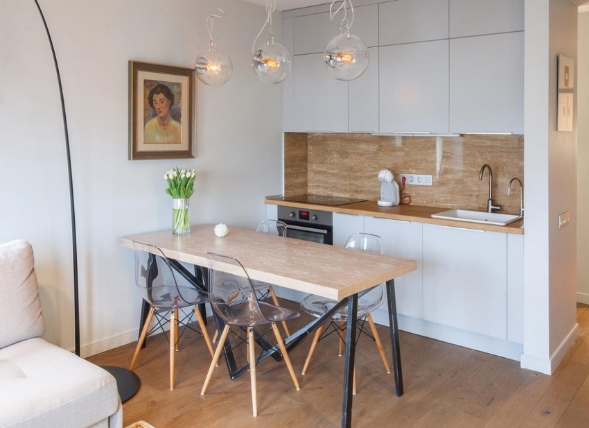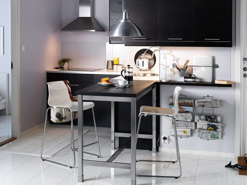 Useful advice! A headset and a dining table made of special durable glass or translucent plastic are perfect for a compact kitchen. Such furniture is practically invisible in space and visually relieves it.