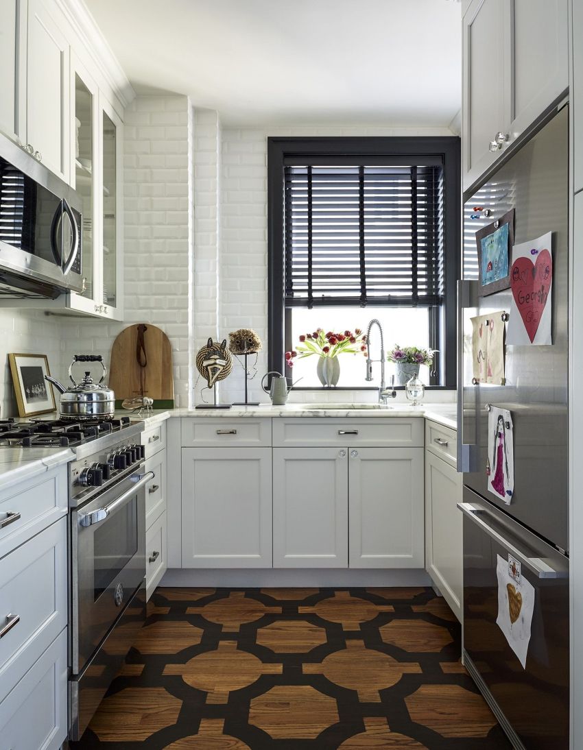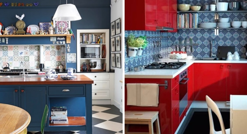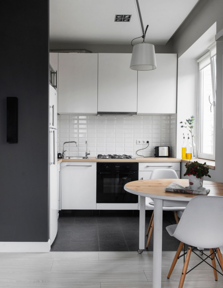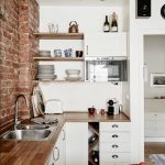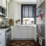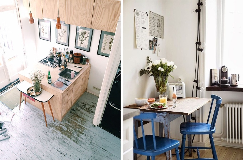 Scandinavian style is often used in a small kitchen. It is embodied using discreet tones, slightly diluted with various patterns, modest wooden furniture, steel appliances and rustic textiles for decoration. If you want to make the interior even more stylish, add color with bright kitchen utensils. Use quirky plates with cute patterns, an interesting shaped pepper shaker and salt shaker, or potholders in the form of funny faces.