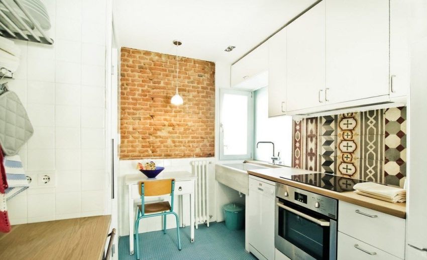 Bright elements in the form of a brick insert and an apron with ethno-motives will dilute the monotonous interior