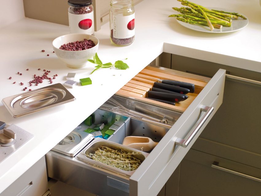 In modern kitchen renovation, there are various options to increase the area of work surfaces. When there is not enough space for cutting and processing food, countertops located at different levels, or pull-out ones, help out. They can be pulled out when needed, and when assembled, they do not interfere and it is very convenient and compact.