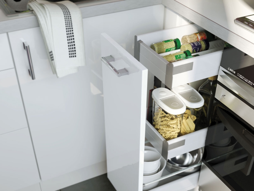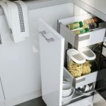 A significant problem of the kitchen in Brezhnevka or Khrushchev is that it is difficult to find a place for refrigerator... If it is small, then you can put it on top of the headset's bedside table, then the space will be used right up to the ceiling. Special devices - storage systems will help to fill the space in the cabinets, with their help it will be easy to organize and put things in order.