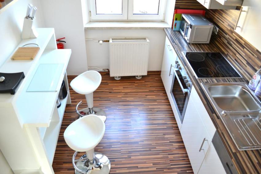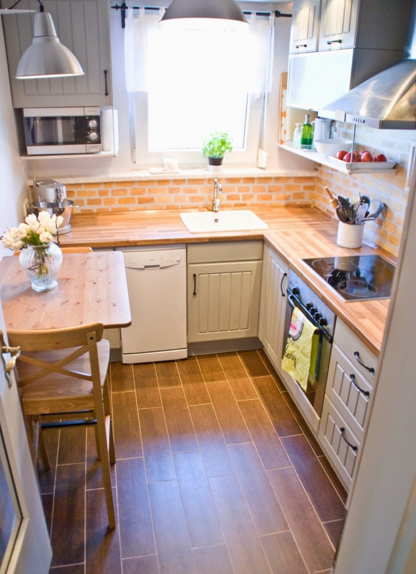 Designers often decide to make floors using different materials and colors, thus delimiting areas. This is justified when repairing a kitchen of 10 square meters or more, but in a smaller room it will be more correct to lay the same material on the floor.