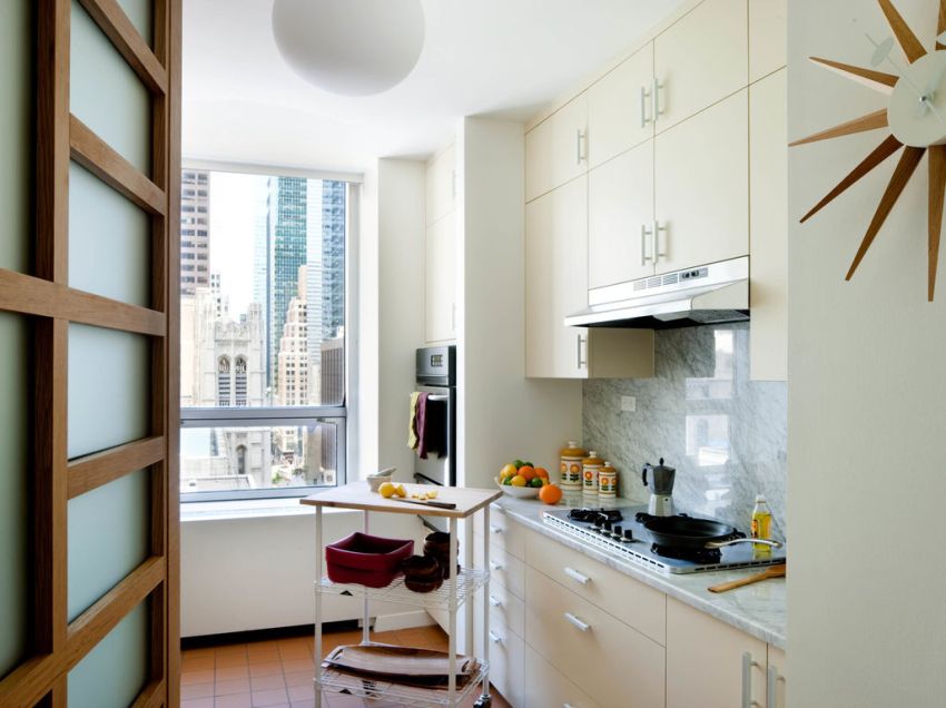 You can significantly increase the space of the kitchen by combining the room with the living room or corridor. Thus, you can move the eating area outside the kitchen, or arrange it in the form of a bar counter, thereby visually dividing the kitchen and living room. However, this solution has a drawback - the spread of smell during cooking, with which not all residents of the apartment can accept. Also, certain inconveniences from kitchen noise will be delivered if the apartment is small and someone is resting in the living room at this time.