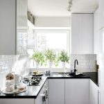 In a situation where furniture in the kitchen is arranged in a circle, the surface between the tiers of the cabinets, as well as the kitchen apron, are recommended to be performed in light colors to prevent the creation of an enclosed space.The window opening can be visually expanded if the horizontal surfaces around it are decorated in white. Thus, the room can be made brighter.