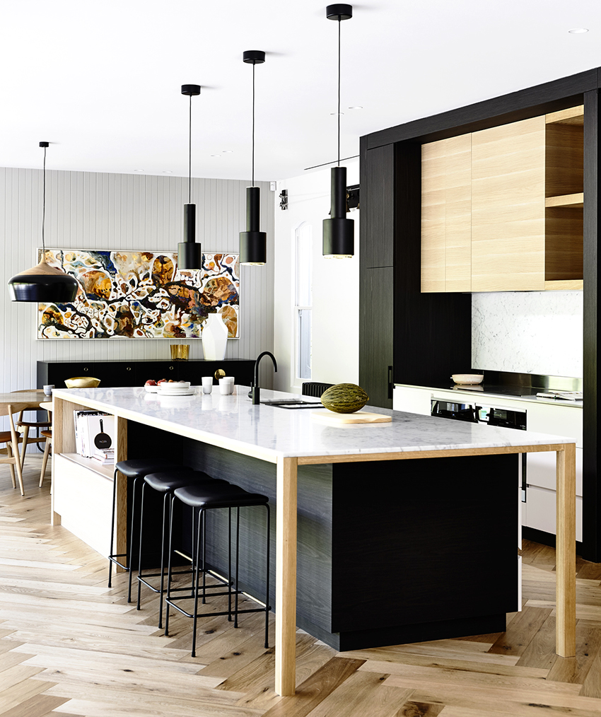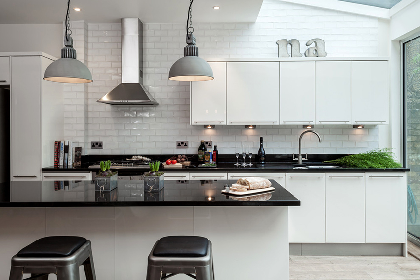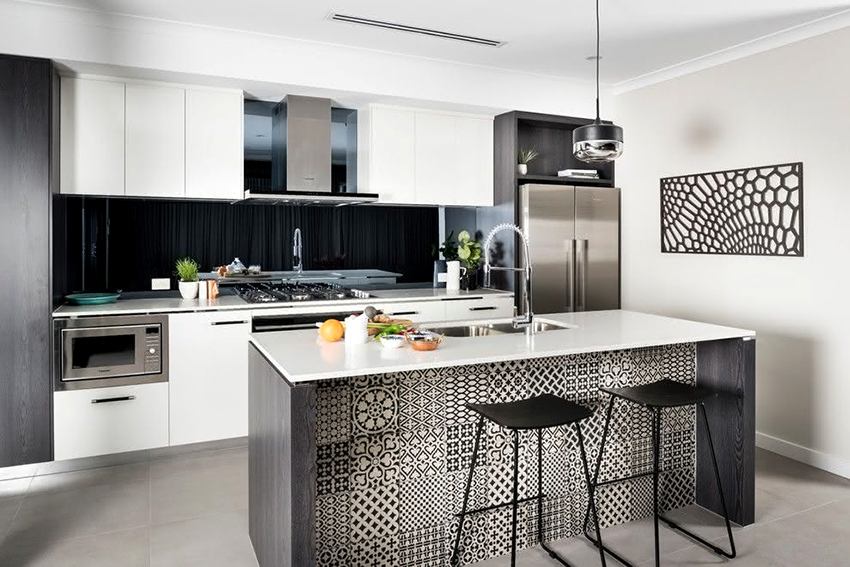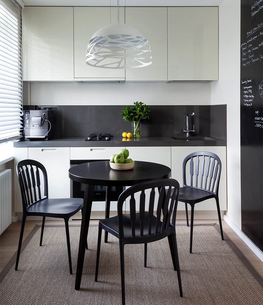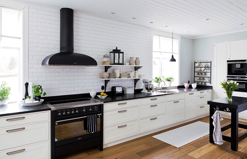 Another important point to consider is the fact that the black shade is more easily soiled, because fingerprints remain on glossy surfaces, stains and dirt are better visible. Therefore, studying photos of kitchen facades in black and white, you can see that glossy surfaces are used less often, and preference is given to textured wood-like options, which do not get dirty so quickly. Other helpful tips for decorating a two-tone kitchen: