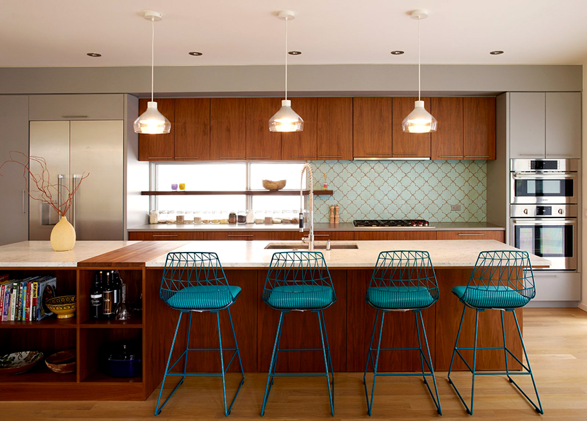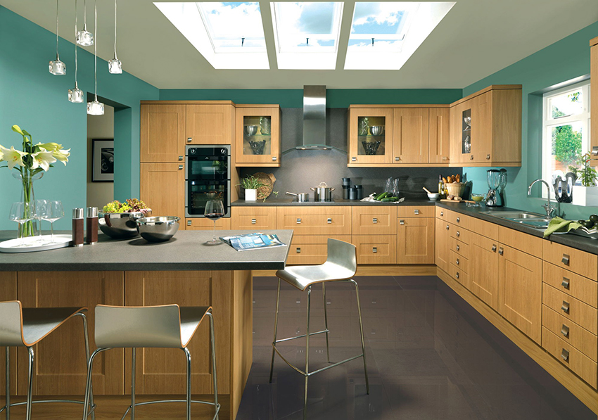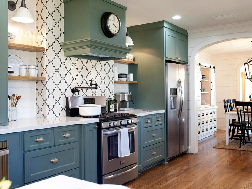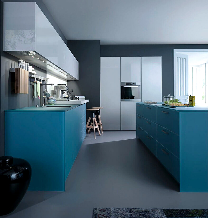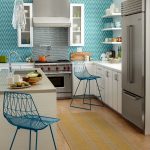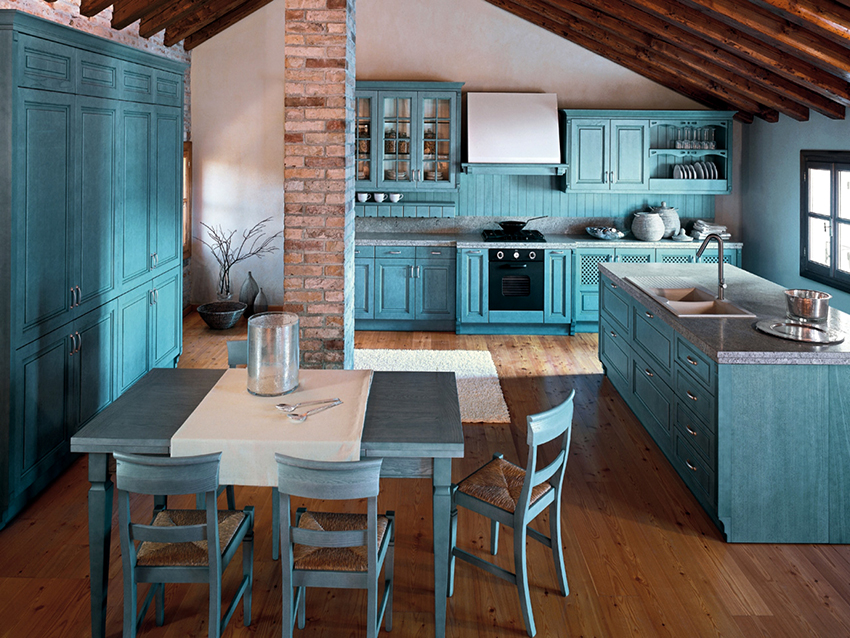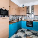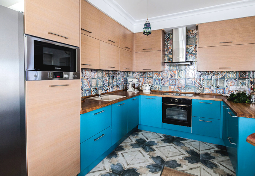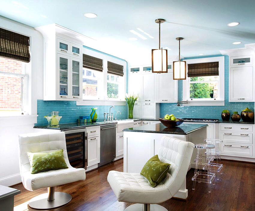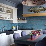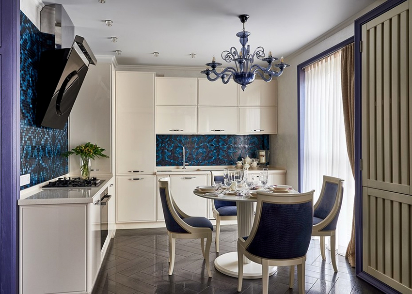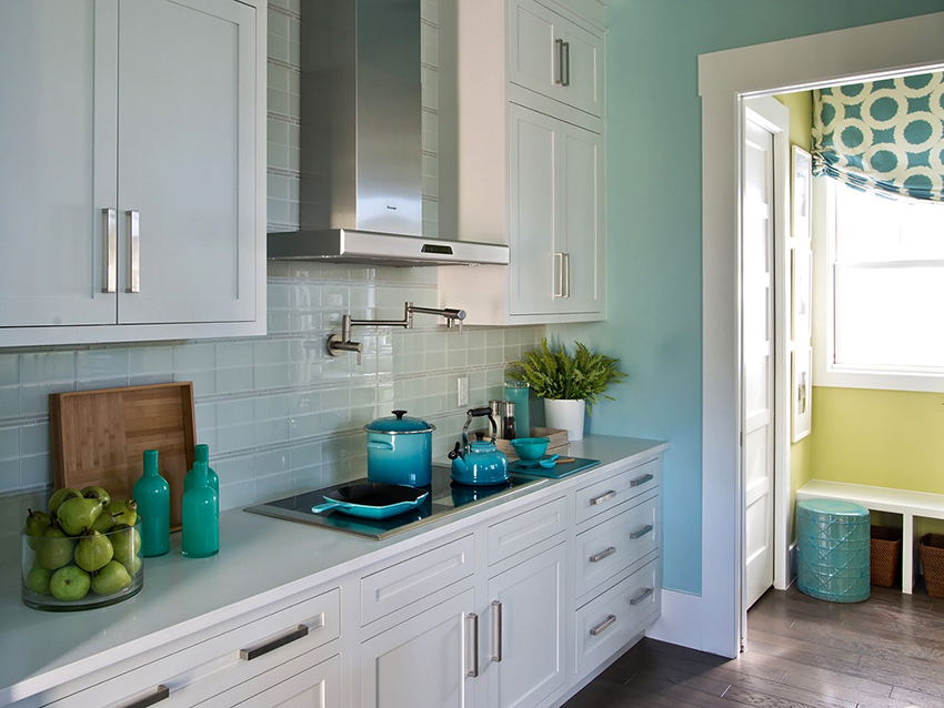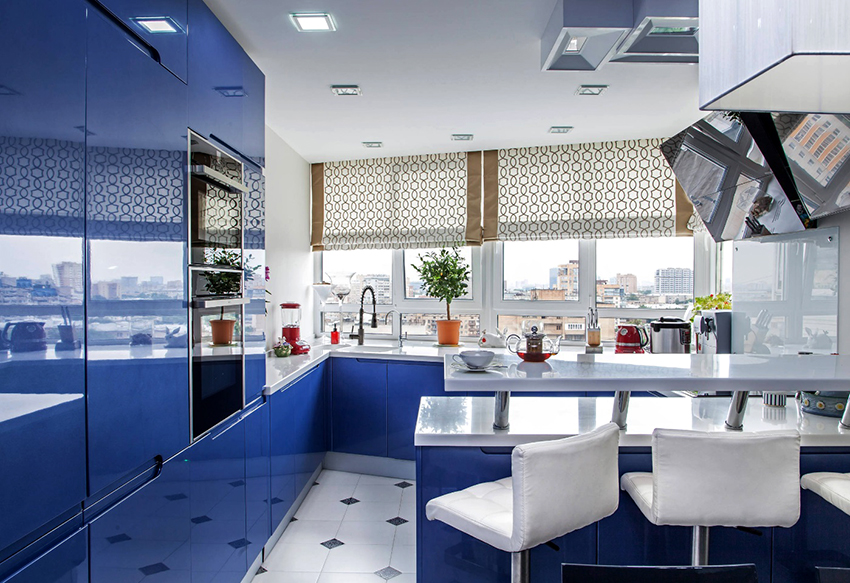 Light cold tones visually increase the height of the walls. Therefore, if the room is not high, it is advisable to make the kitchen in blue, while it is recommended to leave the walls plain.