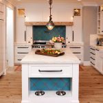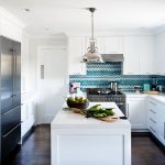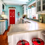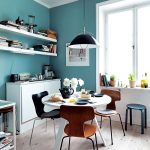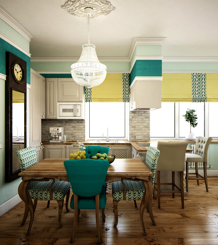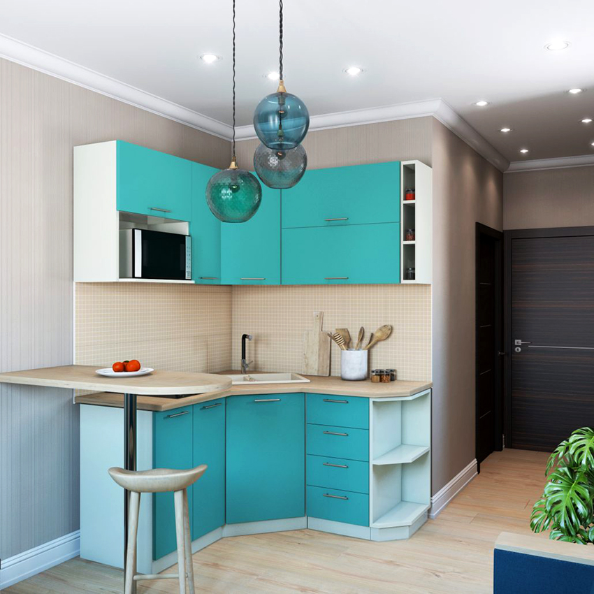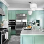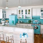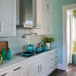 If you want to make the turquoise kitchen more delicate, use pearl and pearl colors that are suitable for decorating the ceiling, curtains, apron or countertop. Walls can be done in neutral beige and furniture in navy blue. The combination of a beige kitchen set with a turquoise apron also looks good.