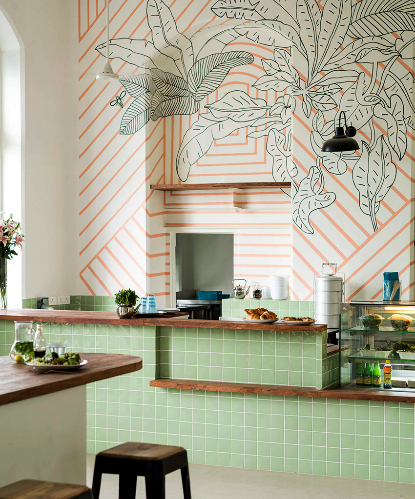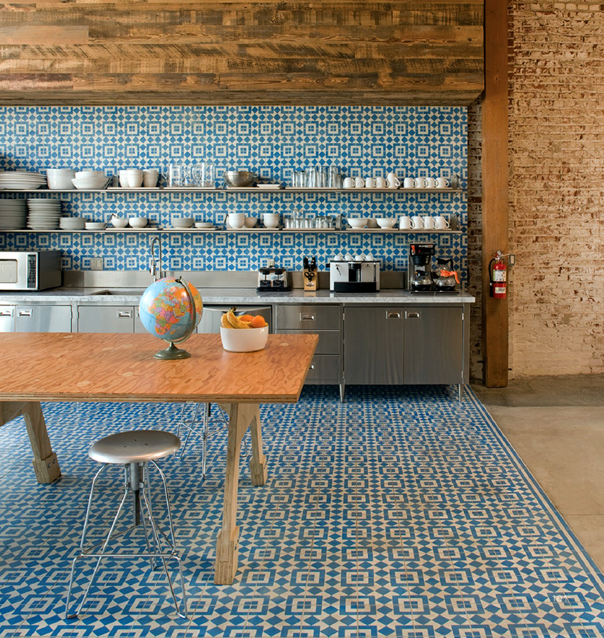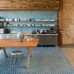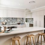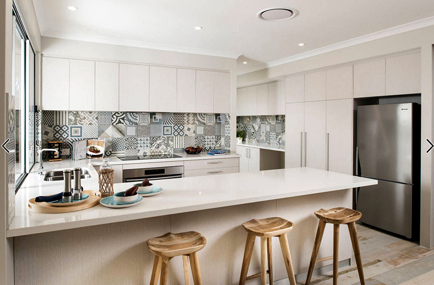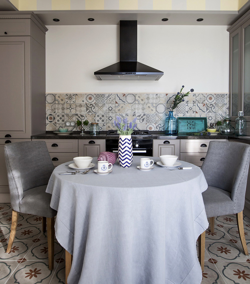 - Geometrically regular shapes on kitchen walls, such as squares, intersecting stripes, create the effect of a continuous space.