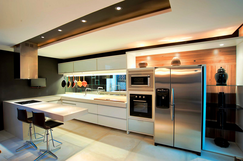 - High tech. The trend prefers monochrome kitchen interiors. Most often, the kitchen is made in gray, silver or white. In the interior, it is relevant to use the color stainless steel - a steel tabletop will look especially good.