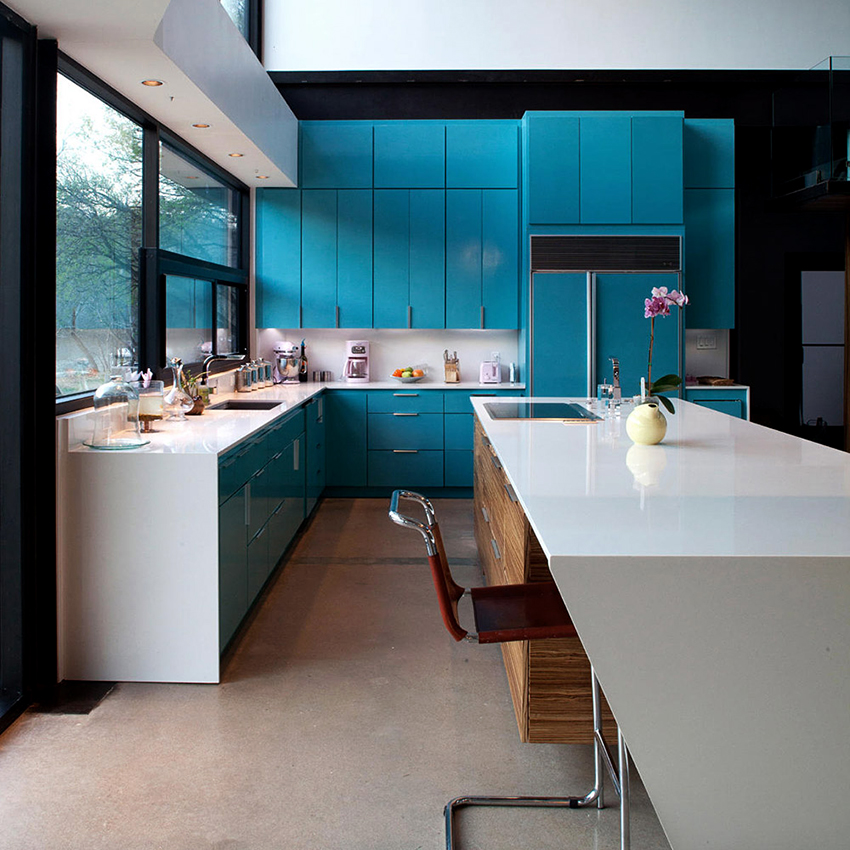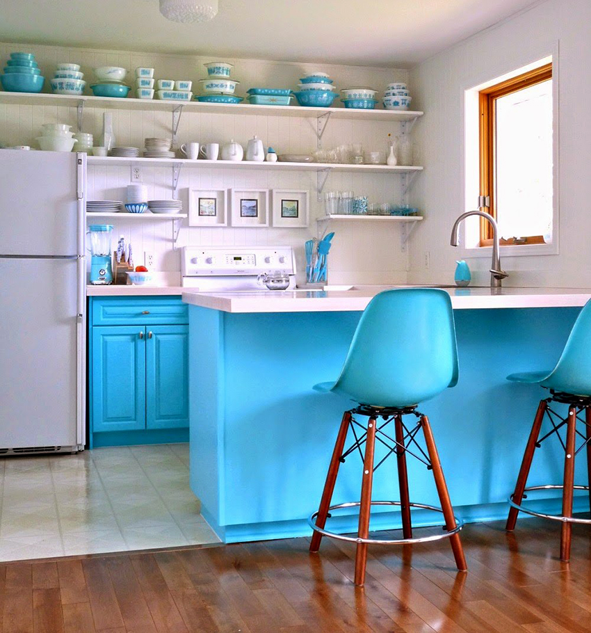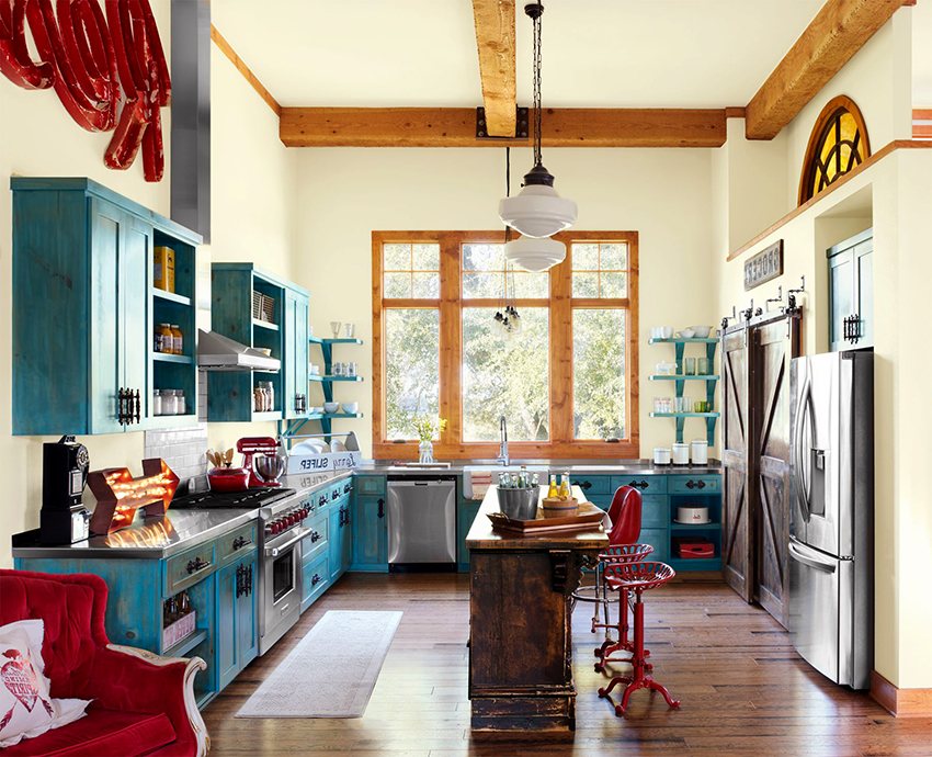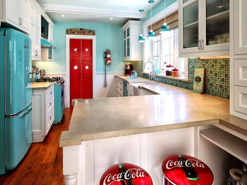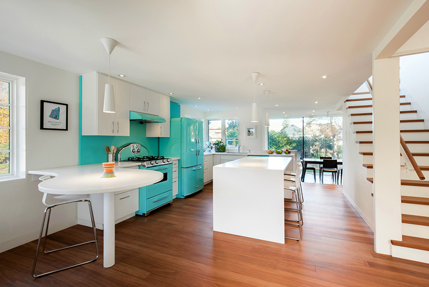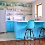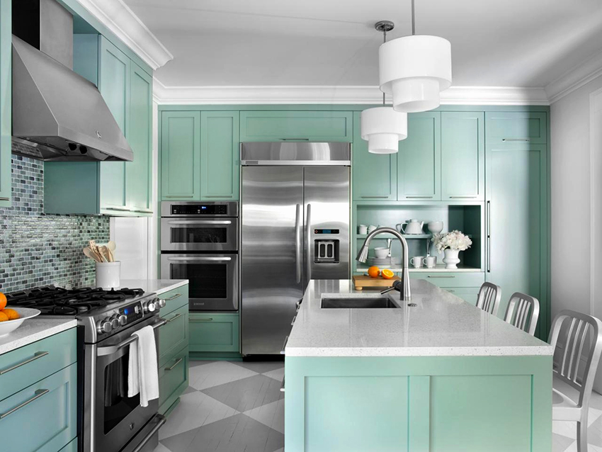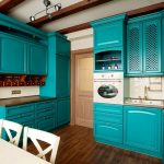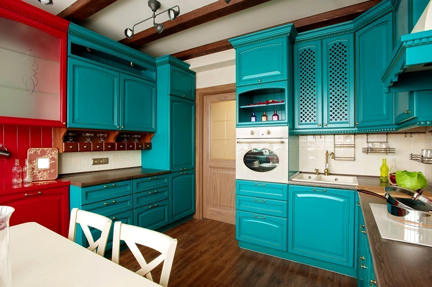 If you look at photos of turquoise kitchens, then you can find many shades here - from deep sea green to pale azure. Such nautical motifs are considered relaxing. Choosing more cool blue tones will make the room appear cooler, and choosing a more intense turquoise hue will make the kitchen feel warmer. The turquoise design option is most often used when decorating kitchens in the following styles: