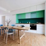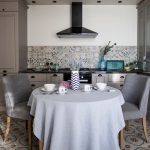 - The backsplash and countertop are made in colors that are opposite to the shade of the kitchen furniture and dining group. With the help of contrasting details, you can correctly place accents in the room.