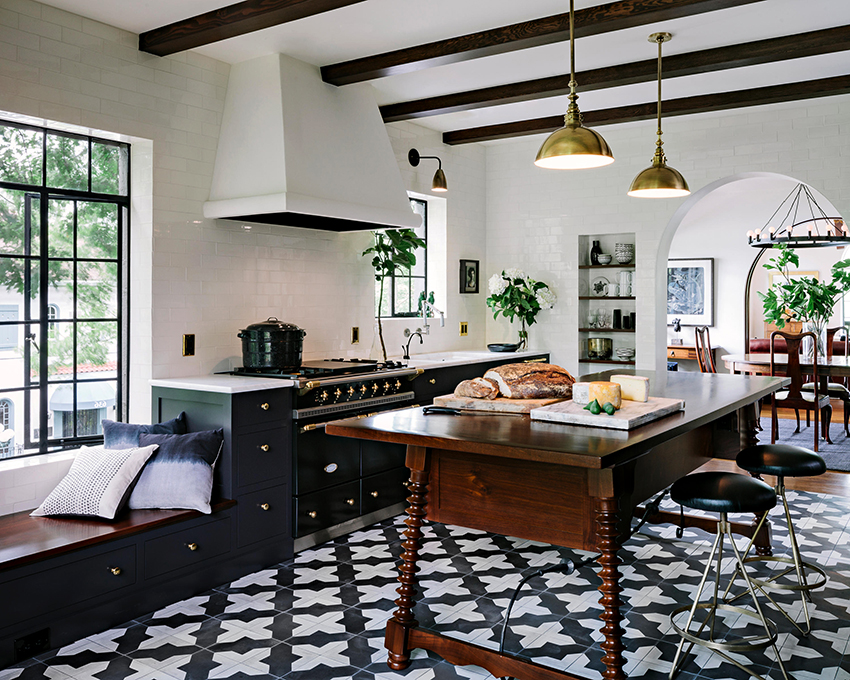- Black and white square tiles laid diagonally on the floor will visually expand the volume of the kitchen.
