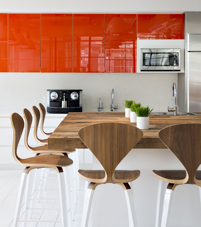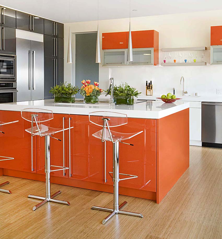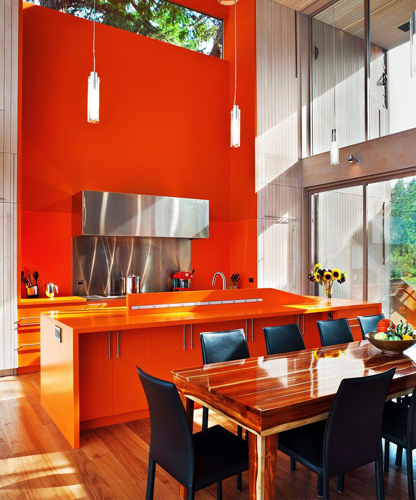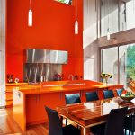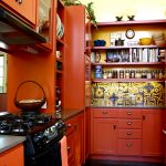 Orange is considered a juicy color that helps to awaken appetite. It is especially important to make such a kitchen for families with small children. Indoors, it is appropriate to use all shades of orange that remind you of a warm summer: orange, amber, peach. Orange is a versatile option because it fits well into the interior of both small and large kitchens.