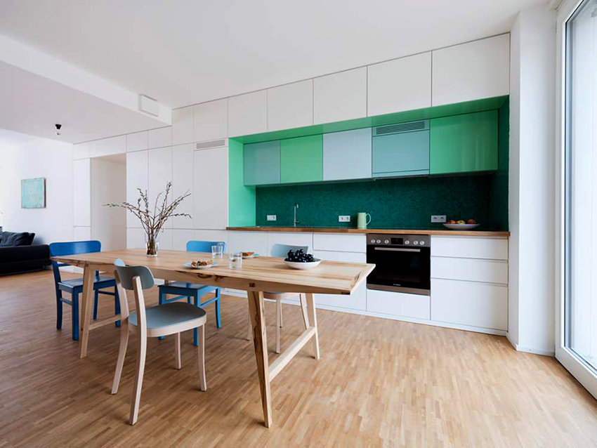 Colored kitchens are created by combining different shades of the same range. It is important to adhere to the principle of proper color distribution. Usually in such kitchens up to three shades are used. The main color, which was chosen as the main one, should occupy up to 60% of all surfaces, 30% should be allocated to the share of the second most important color, and the third should not be used more than 10%.