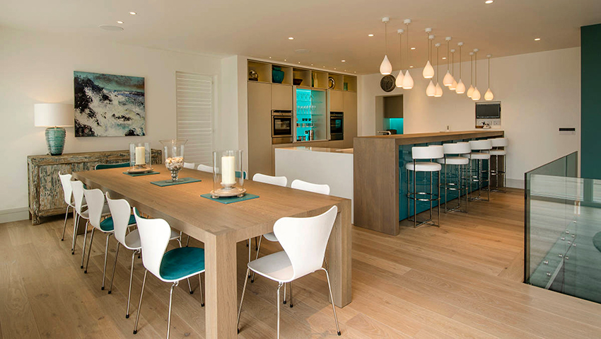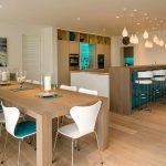 It is important to note that the brighter the turquoise color used, the lighter the satellite shades should be, although it is often possible to find such options when the dark rich blue color of the kitchen is used in combination with the chocolate shade or the color of dark wood. If the kitchen is large, you can choose a strict option using a turquoise-black design. However, in order not to make the kitchen completely gloomy, the designers advise using not pure black color, but its shades.