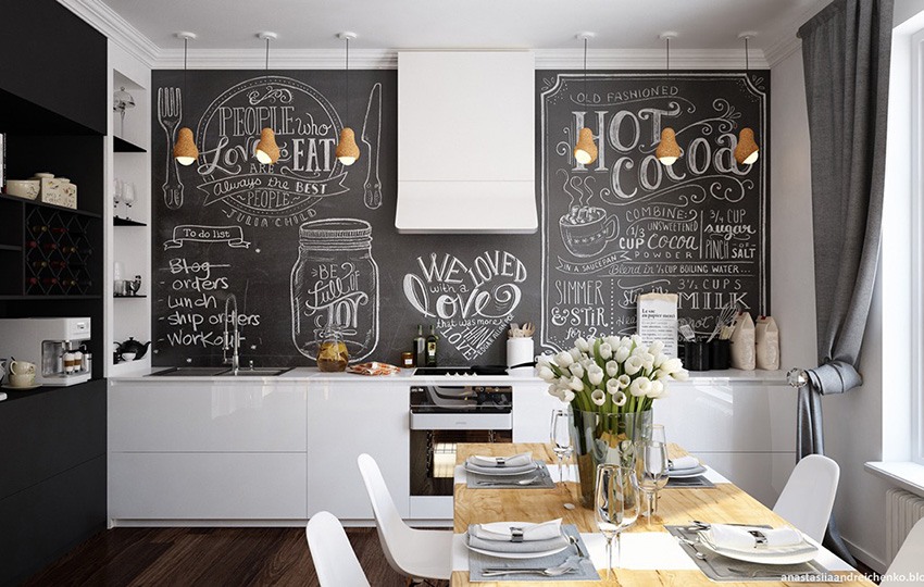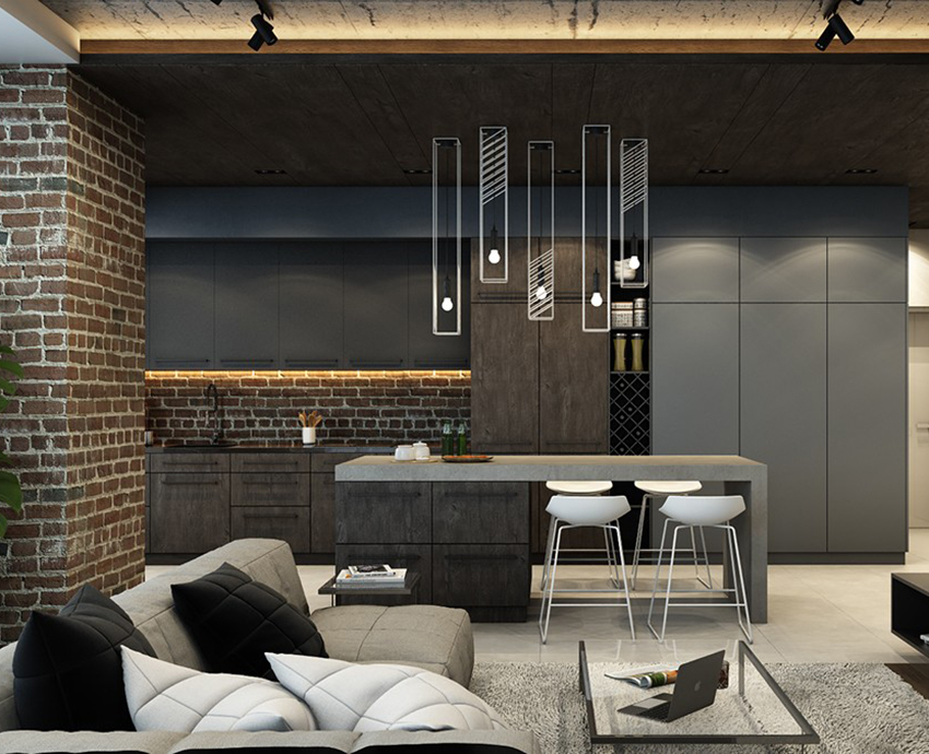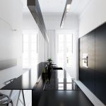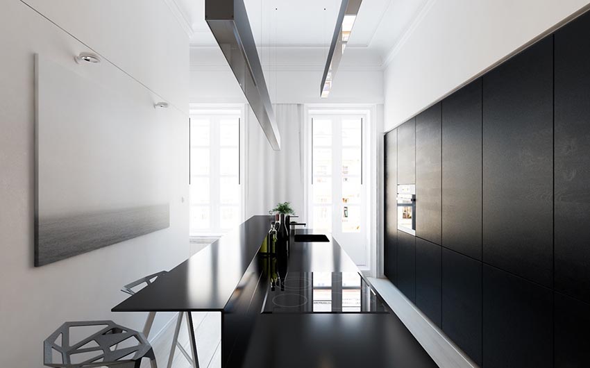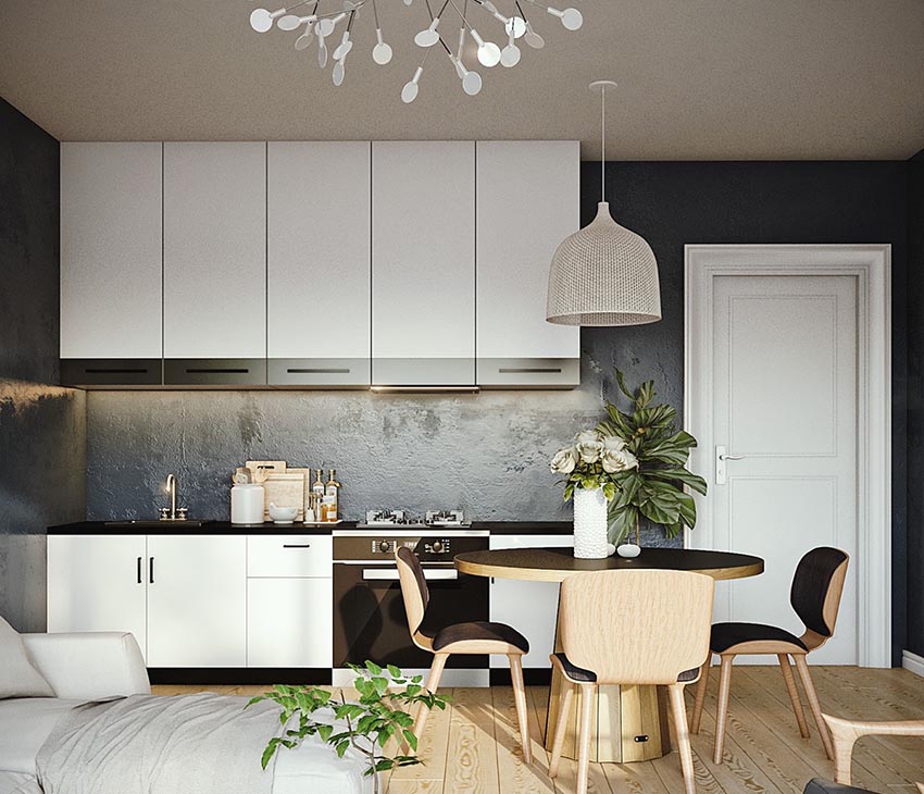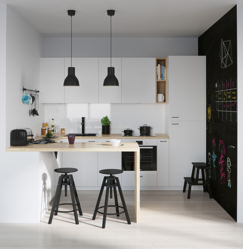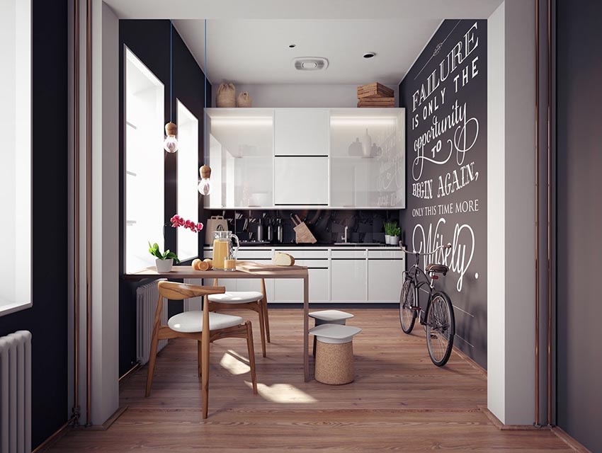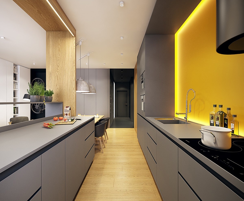 A straight fitted kitchen runs along one of the long walls. This option is used for small families where there is no need to prepare large amounts of food. With this arrangement of furniture, it will be possible to arrange a minimum of household appliances. However, in this case, you can even organize a full dining area with a sofa or chairs in a small room.
