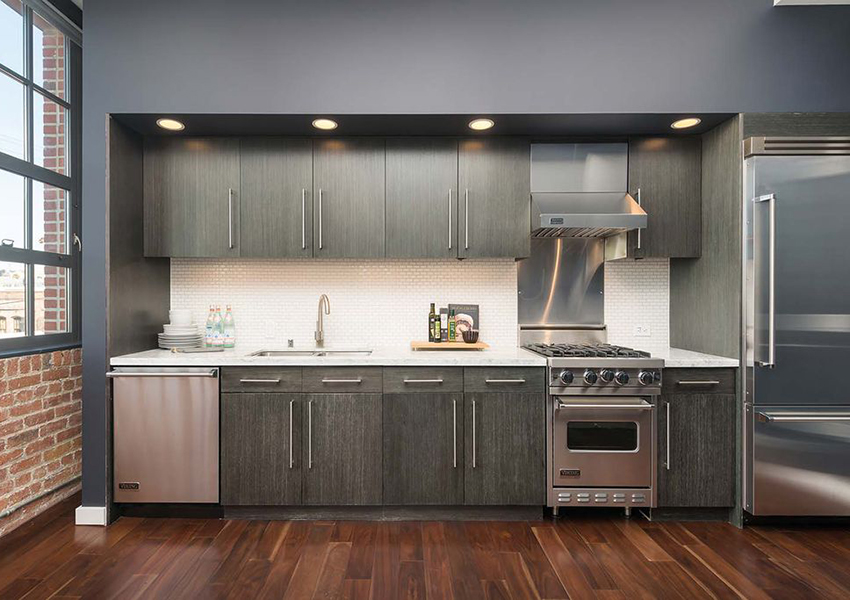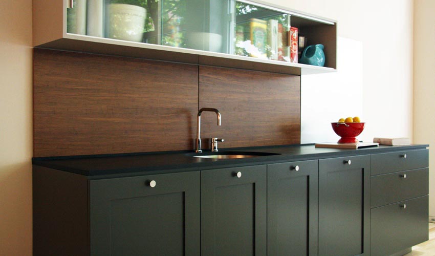 The material must have a thermal protective (to prevent ignition and escape of harmful vapors) and moisture resistant coating. The price of a built-in kitchen to order from this material with a straight-line arrangement of furniture will vary within 35-47 thousand rubles.