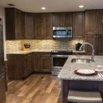 The cabinet design is matched to a specific type of household appliances. The hob can be part of a cooker or combined with an oven. It is flush-mounted into a special cabinet, located at the level of the table top, or raised by 4-5 mm above the cabinet surface. The bottom cabinet for the hob most often has a width of 60–120 cm, a height of 70–85 cm, and a depth of 55 cm. Different options for the location of the hob are clearly shown in the photo of built-in corner kitchens.