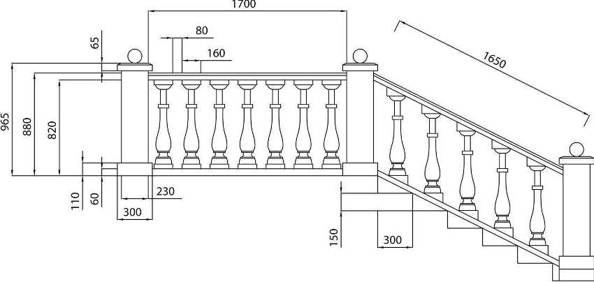 At the design stage, it is imperative to measure the height of the railing. Experts recommend that this parameter varied from 0.7 to 1 m.In order not to miscalculate with the number of racks, you need to calculate the future distance between them.Then it will be easier to install the balusters on the stairs, because all dimensions will be strictly observed.