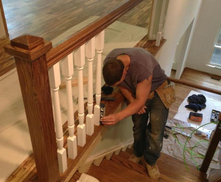 Correct installation of handrails and balusters of a wooden staircase