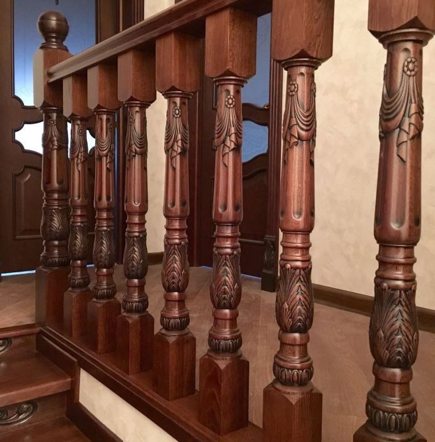 Carved types of balusters are stylish and spectacular. They are often called sculptural. Mostly they are made by hand. Expensive wood is taken as a basis. Therefore, the high price of such products should not surprise consumers.