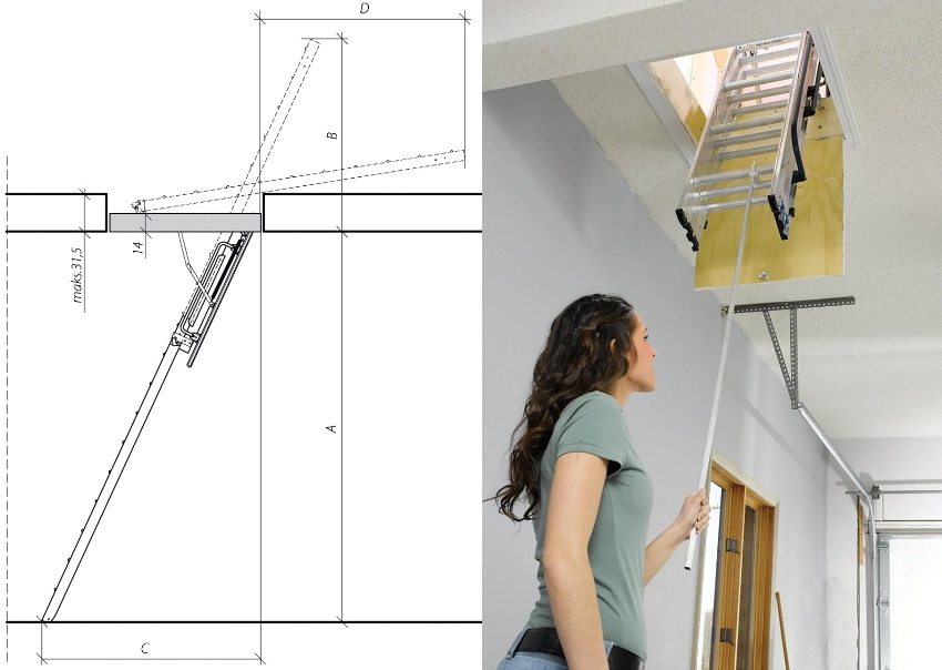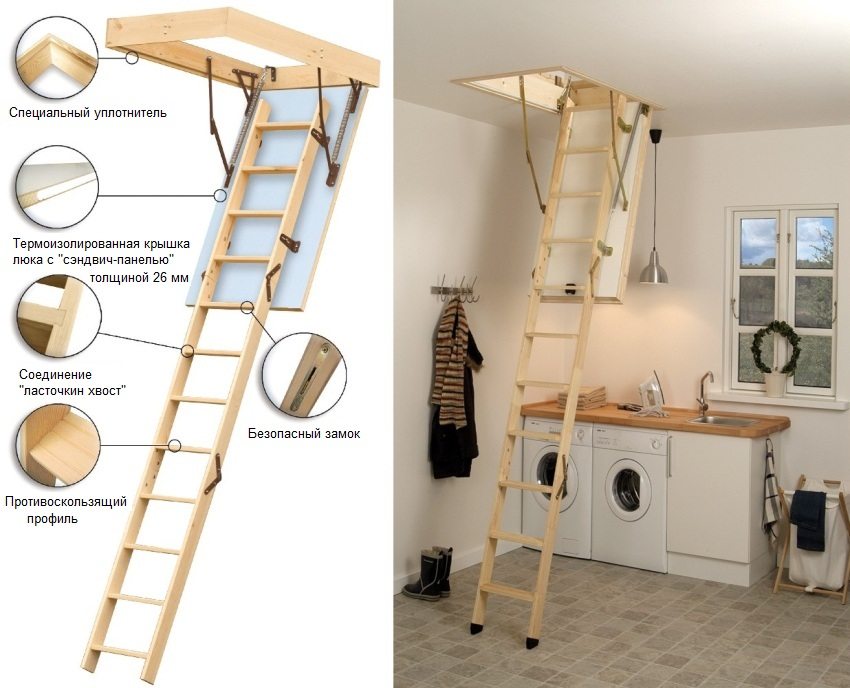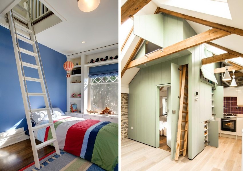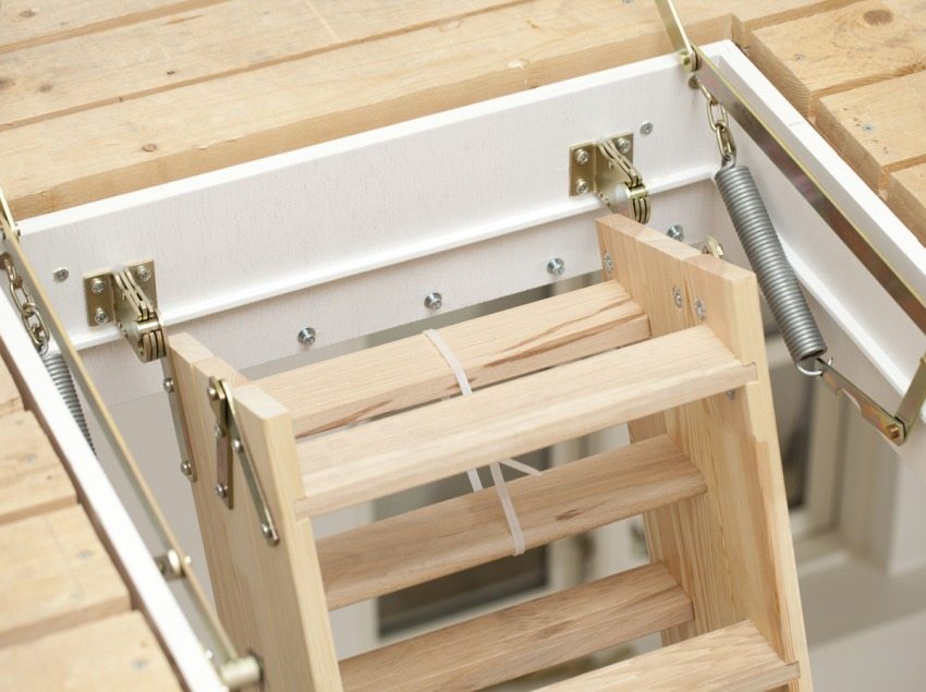 Folding ladders are quite complex in design, but provide maximum space savings and perfect order. When folded, such a ladder is fixed to the wall. The steps are fixed on the bowstring with card loops. The folding ladders are independent of the hatch.