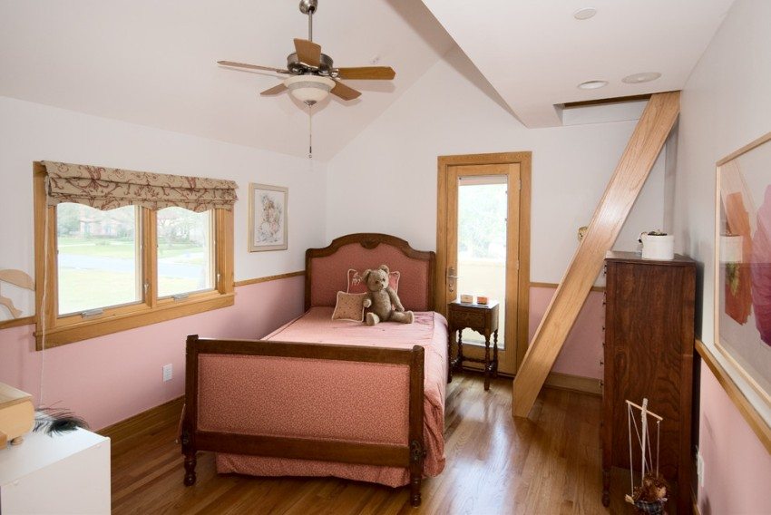 All elements are connected to each other with hinges. To securely fix the folded ladder, use a metal or rope loop. This simplest construction is always placed against a wall. And although it saves space, the room will not become more beautiful, because all the details of the folding ladder will remain in sight.