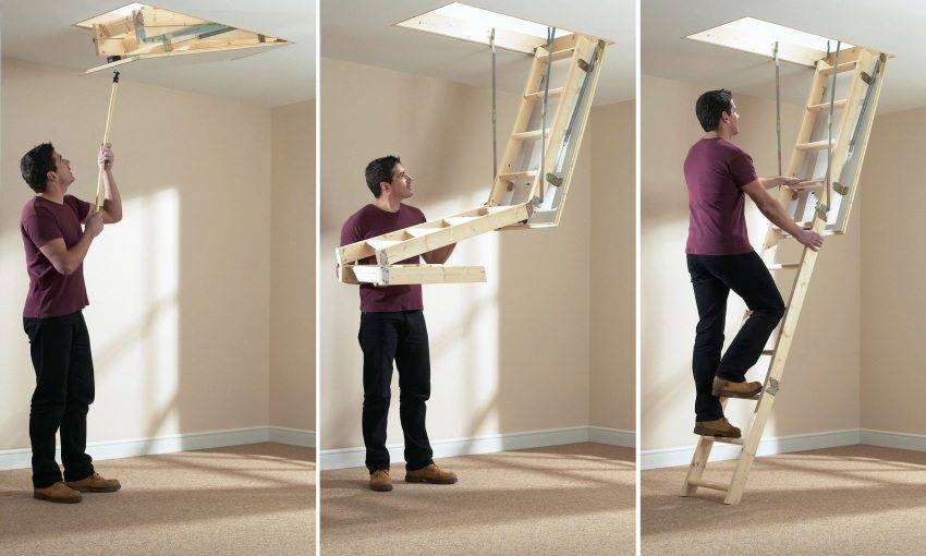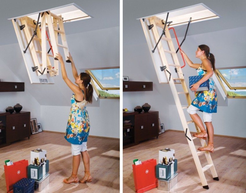 Folding ladders combine the advantages of the first two types and, at the same time, are devoid of their disadvantages. They are safe, easily fit into any design, save space, are extremely easy to use, and the quite affordable price of attic stairs with a hatch will be a nice bonus when buying.