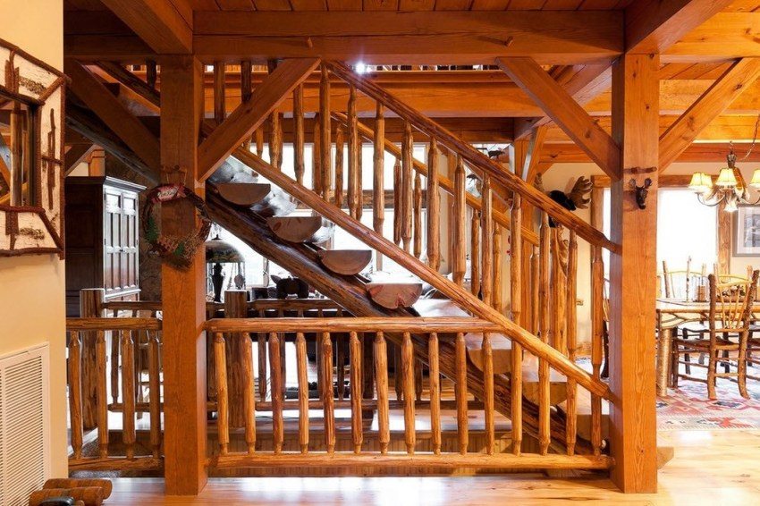 An extremely large number of wooden stairs to the second floor, photos of which can be found anywhere, are equipped with fences and railings. They rest on racks, between which various decorative elements are installed. Among them, the most common are balusters, which are carved with a bizarre column shape. Sometimes there are options in which the space between the posts is filled with forged patterned elements. They are in perfect harmony with the massive wooden structure of the stairs.