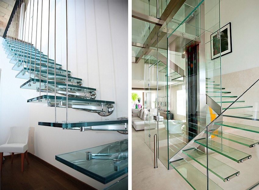 Stairs made of metal and tempered glass look light and airy, but they are reliable and comfortable in operation