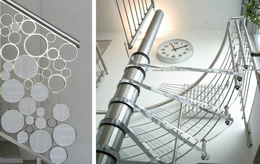 Stainless steel handrails for stairs on a metal frame have become very popular. Stainless steel railings versatile in operation, do not require special care. They must be wiped from time to time with a napkin dipped in a special composition to give shine. At the points of sale and on the websites of manufacturers, a huge selection of accessories for stainless steel railings is offered.