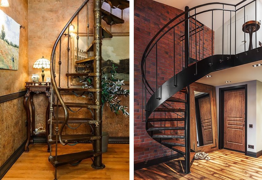 - screw (spiral) staircase systems. These stairs differ in that the steps are arranged in a circle, due to the fact that one end of the step is wider than the second. The supporting element is a pillar or column, around which the steps are mounted. Their advantage is that, with the same step length, they take up much less space in comparison with marching counterparts. Making spiral staircases from metal with your own hands (their drawings and diagrams are complex) is a rather laborious process in technical terms, requiring the necessary stock of knowledge and experience.