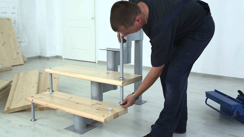 When the first blank for the step is ready, a temporary step from the board is laid on it, then all the following "kerchiefs" are gradually mounted.