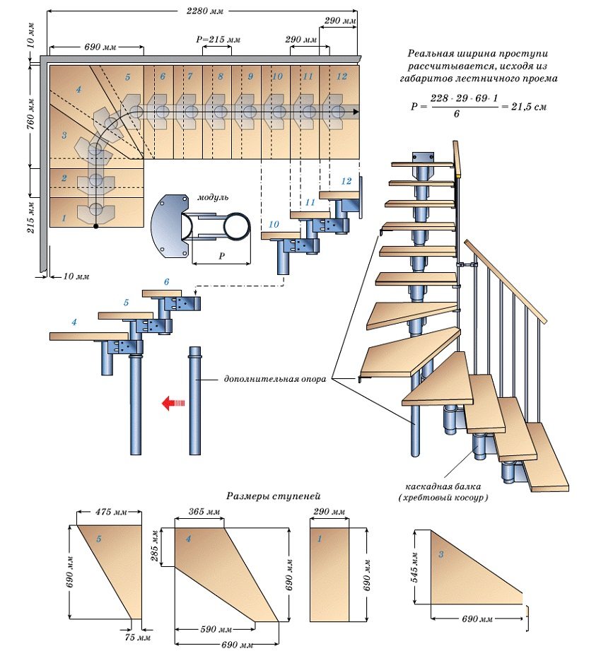 Work begins with the choice of a staircase design: in this case, it will be a stringer structure. A staircase diagram is being developed with all the necessary dimensions and taking into account the location of the turning steps. The scheme will be needed throughout the entire time of manufacture and installation of the stairs.