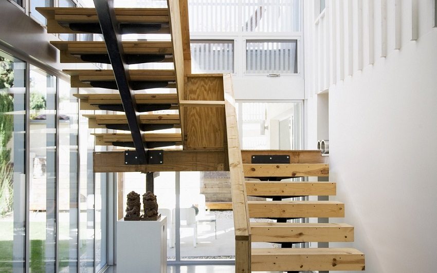 Oblique supporting frame. With this method of arrangement, the frame is a kind of support for the steps of the stairs. This ladder system is robust and reliable. The number of support stringers depends on the stair design and the expected load.