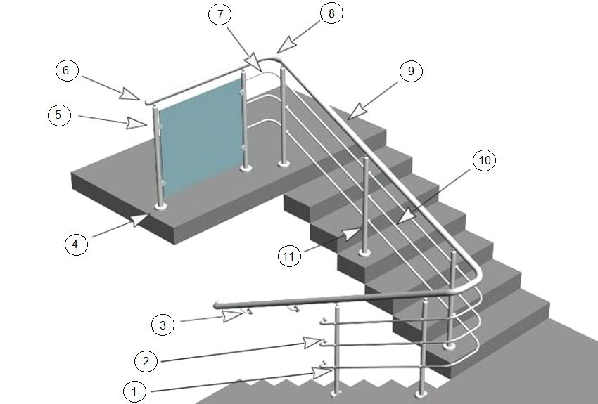 Stainless steel handrail construction elements: 1 - bowstrings, 2 - handrail brackets, 3 - wall brackets, 4 - bottoms of the posts, 5 - glass holders, 6 - plugs, 7 - bowstring turns, 8 - handrail turns, 9 - handrails, 10 - bowstring, 11 - stands