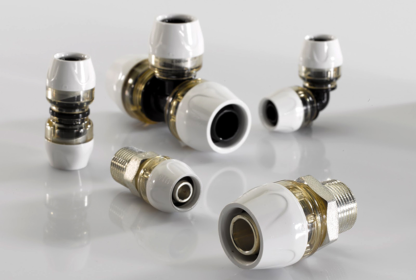The last two options are new engineering developments. The connection of system elements by means of push fittings is carried out in a matter of seconds. This type of reinforced plastic fitting consists of a body, retaining shoe and ring. The first element is made of polyphenylsulfone or non-ferrous metal. The product has the shape of a corner, a cross, a tee, and is also used as a coupling.