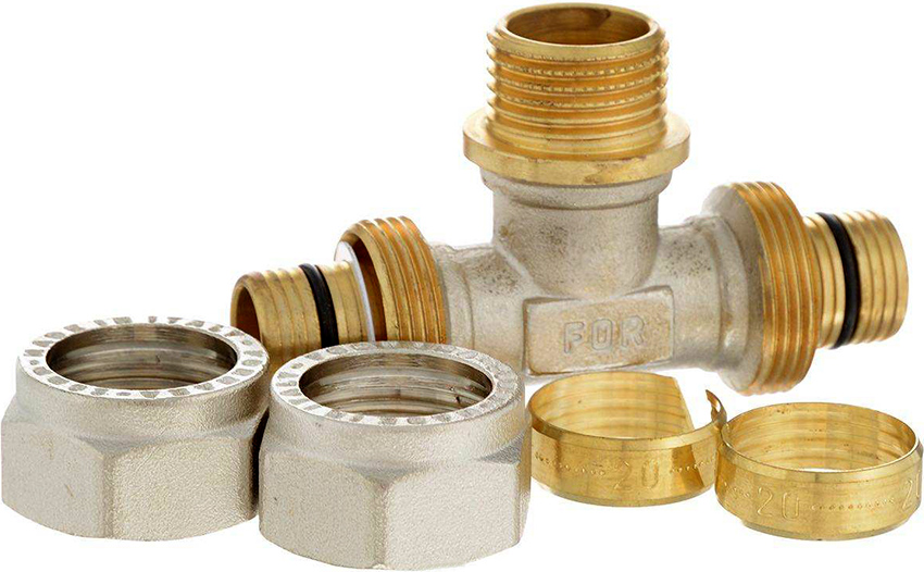 Compression press fittings are represented by elements that consist of a body, a sleeve and a ring. The body is made of bronze or brass, often has a galvanized coating. Depending on the purpose, the element can differ in different designs and be presented in the form of a corner, plumbing adapter, tee, cross or water socket.