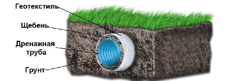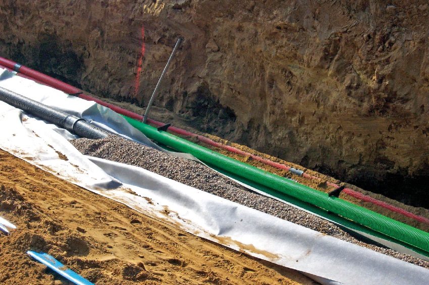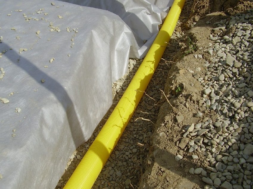 Then sand must be poured into the bottom of the trench. The layer thickness should not exceed 5 cm. Geotextile is laid on top, which is immediately covered with gravel. Pipes are laid on top and rubble is poured again.