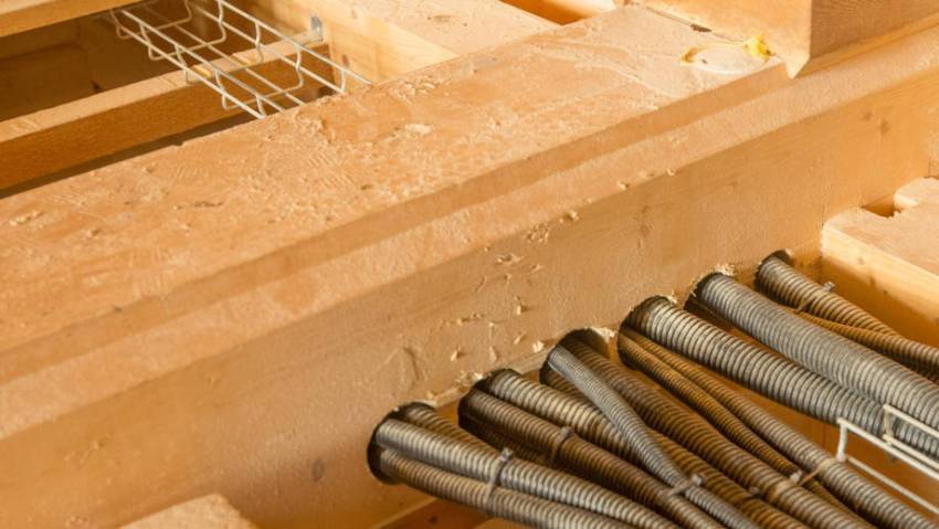 - Installation inside ceilings made of flammable materials (wood cladding, gypsum board, composite shields) requires the use of fire-resistant pipes, preferably with special impregnation. Flammable plastic should not be used in these environments.