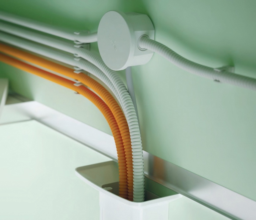 A flexible corrugated pipe with a small cross section makes it possible to install complex joints and turns, up to a 360 ° turn. The cable, embedded in the hidden groove, fills it evenly, reducing the cost of plastering surfaces after the initial stage of installation.