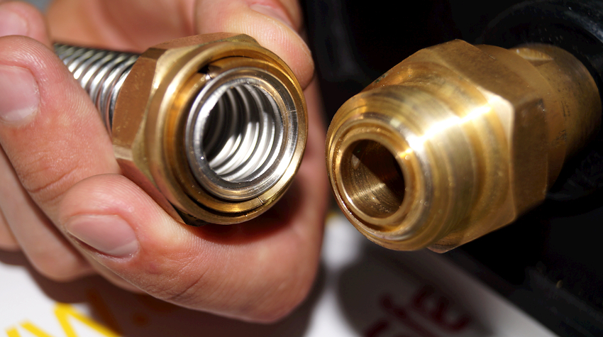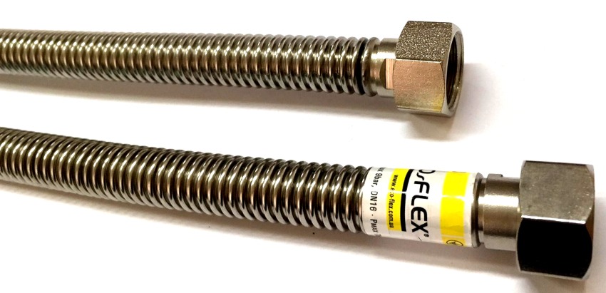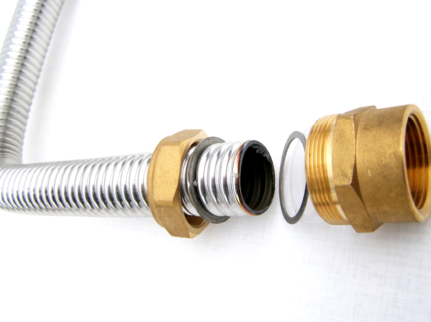 The braid of the corrugated stainless steel gas pipe is marked with a yellow stripe. This is done due to the fact that externally flexible hoses for water and gas are very similar to each other, therefore, water pipes are marked in red and blue, and gas - in yellow. The inch stainless steel liner is usually equipped with special fittings, which are fixed with nuts at the joints, and copper or aluminum washers are used for additional tightness.
