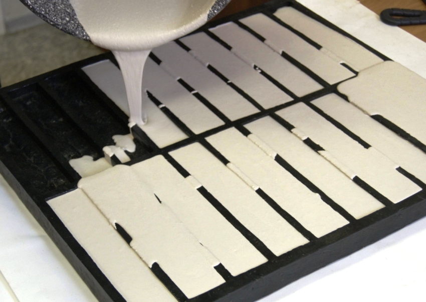 After adding the last component to the mixture, it is distributed in forms and leveled with a spatula. The artificial stone production technology may include one more stage - vibration treatment. Thanks to this, the performance characteristics of the future tile are significantly increased. It is desirable to carry out such processing immediately after placing the mixture in the matrix.