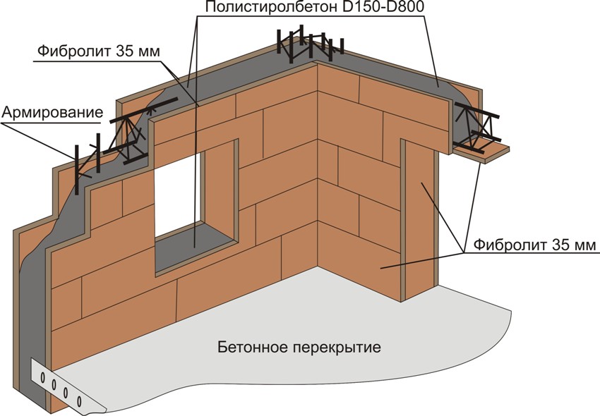 When building from slag or expanded clay blocks, the actions are slightly different. Here they do not use an armored belt, but simply lay out the top row with holes up. Subsequently, these voids are filled with rubble or concrete. Thus, a reinforced concrete structure is obtained.