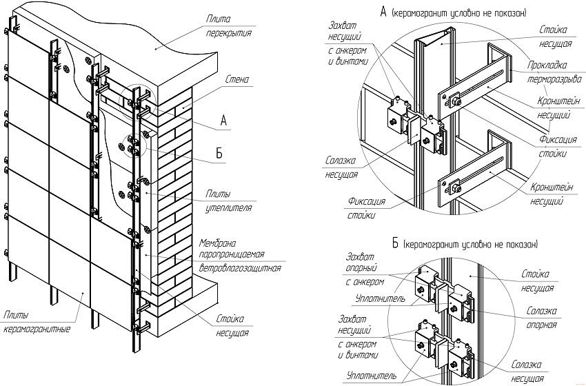 - sub-facing wall - serves as an intermediate structure between the load-bearing wall, the heat-insulating layer and the finishing material slabs. Consists of brackets that are attached to the wall using dowels and anchors, bearing profiles and special fasteners;